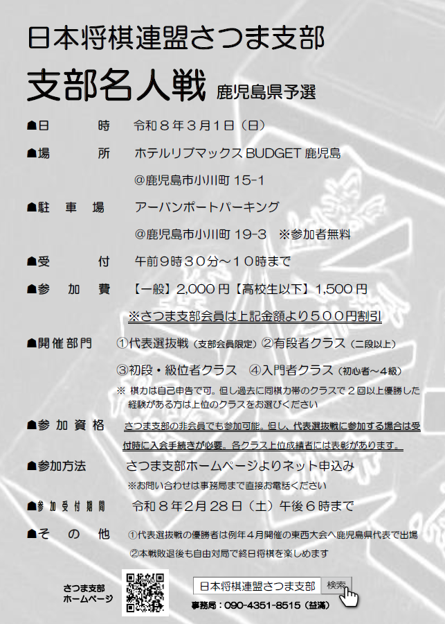 | 参加方法 | 下記のリンクよりネット申込みをお願いします 支部名人戦鹿児島県予選(令和8年)参加申込みフォーム ※今回よりネット申込みにはメールアドレスが必要となります。 ※ご記入いただいた内容が自動返信され、申込内容のご確認ができます。 ※メールアドレスをお持ちでない方は恐れ入りますが電話にてお申込みください。 |
