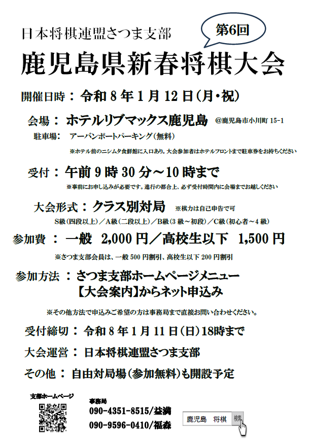 | 参加方法 | 👇下記フォームをクリックし、インターネット申込み 第6回鹿児島新春将棋大会参加申込フォーム ※上記以外の方法での申し込みは直接お電話ください 【さつま支部事務局】090-4351-8515(益滿) / 090-9596-0410(福森) |