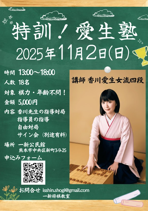 8月には鹿児島にもお越しくださった、大人気の香川愛生女流四段が、11月に2日間にわたって熊本に来訪されます。